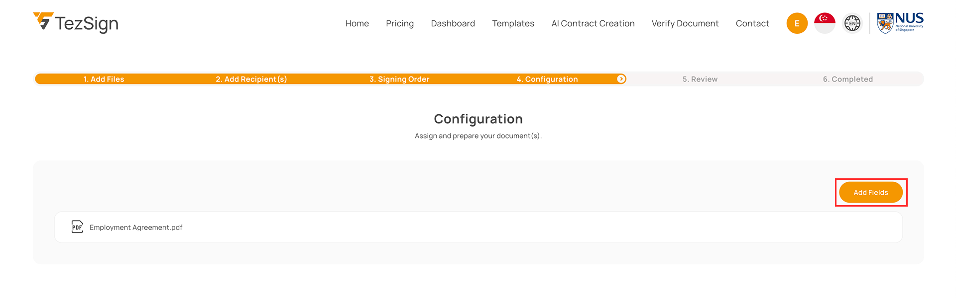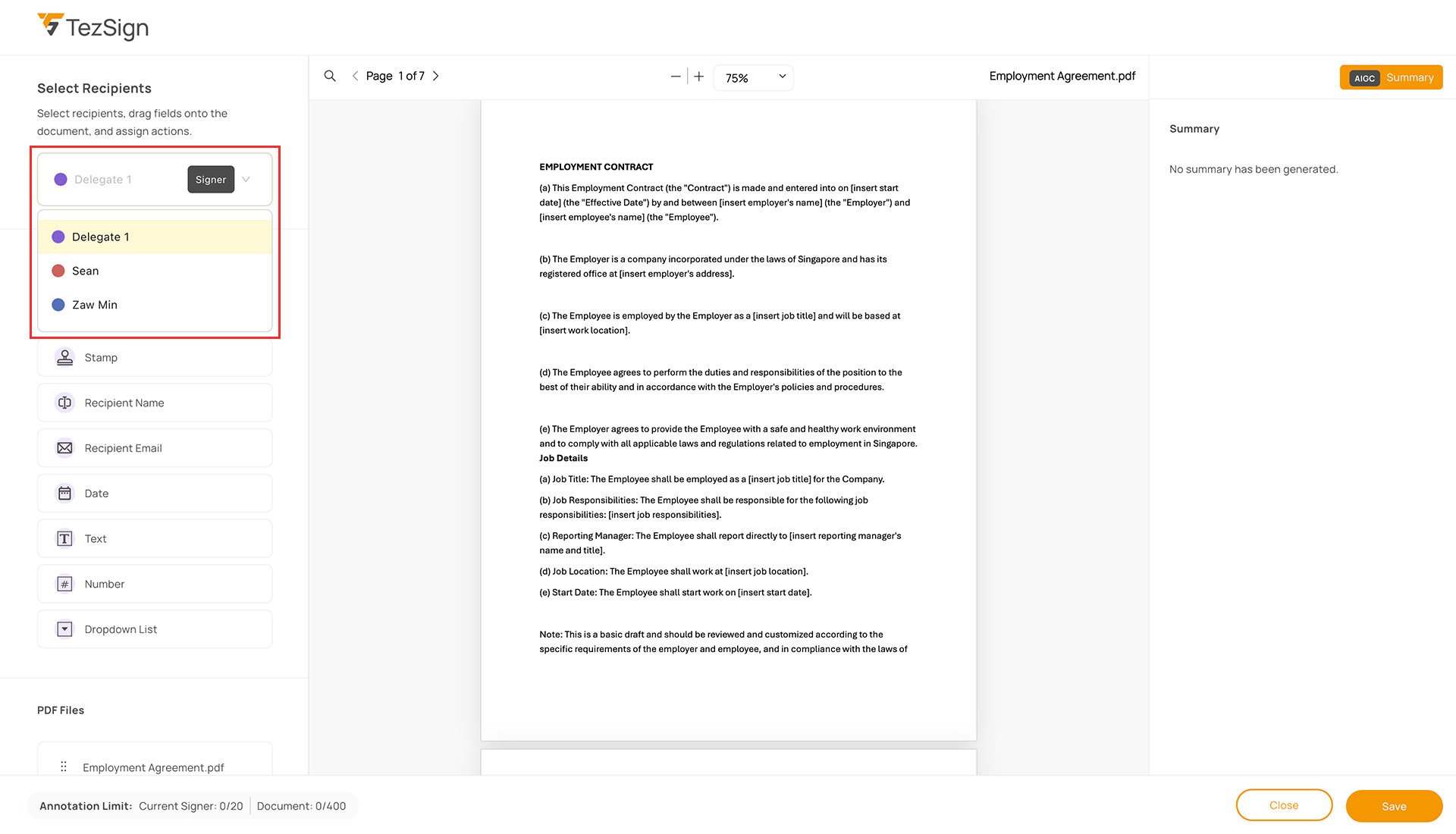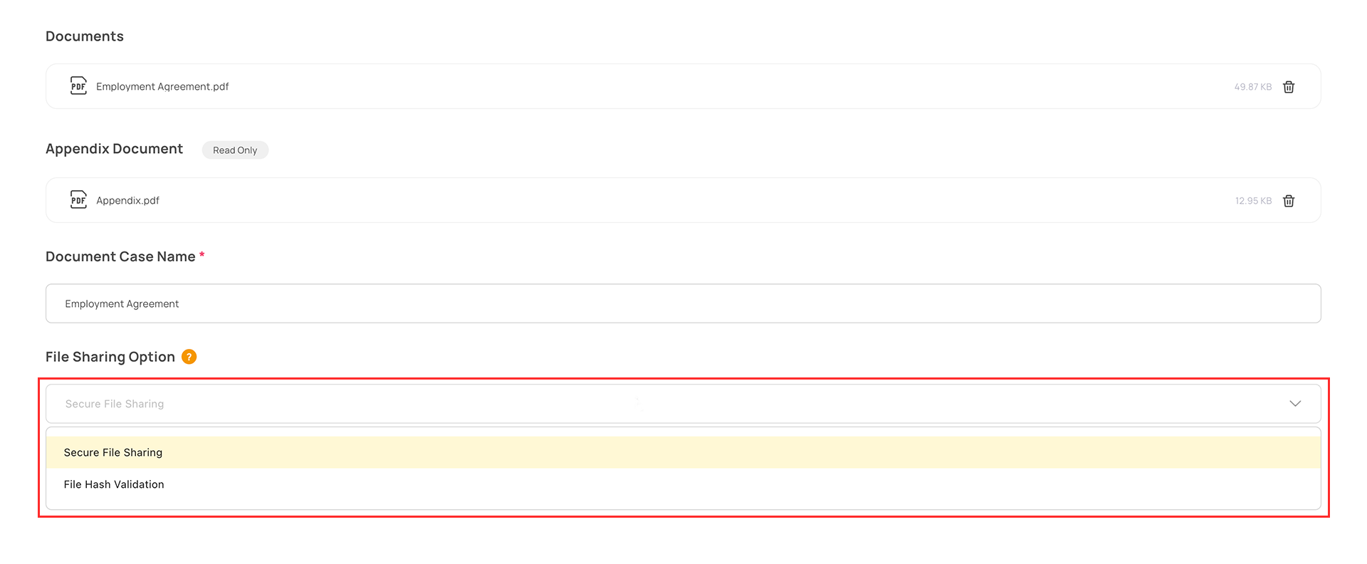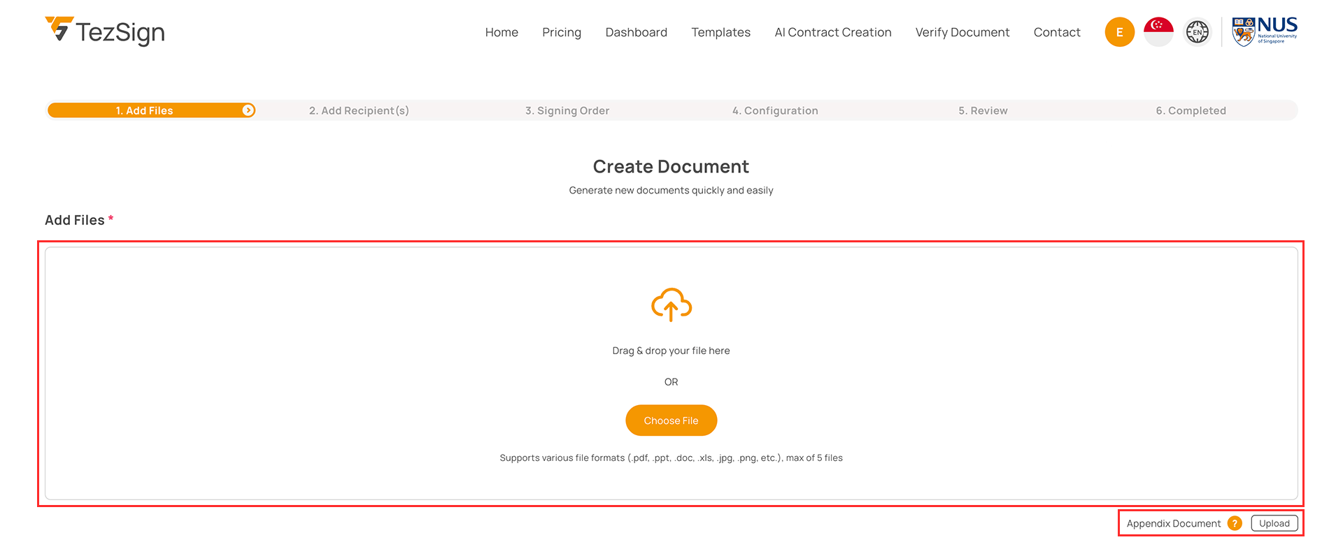 Drag and drop the agreement file, and upload the 'Appendix Document' by clicking the upload button.