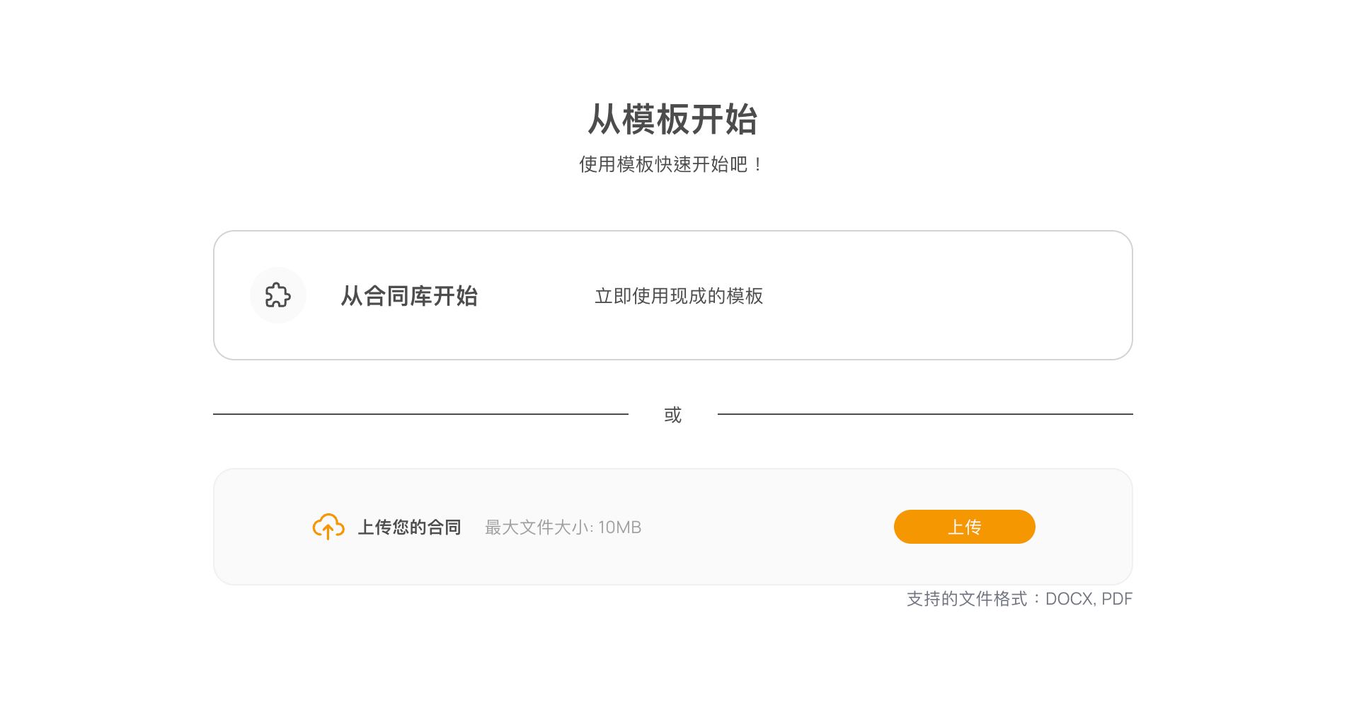从模板开始:点击“模板库”,即可快速使用现成的标准合同模板,您也可从合同库中选择,或上传自有合同文件。