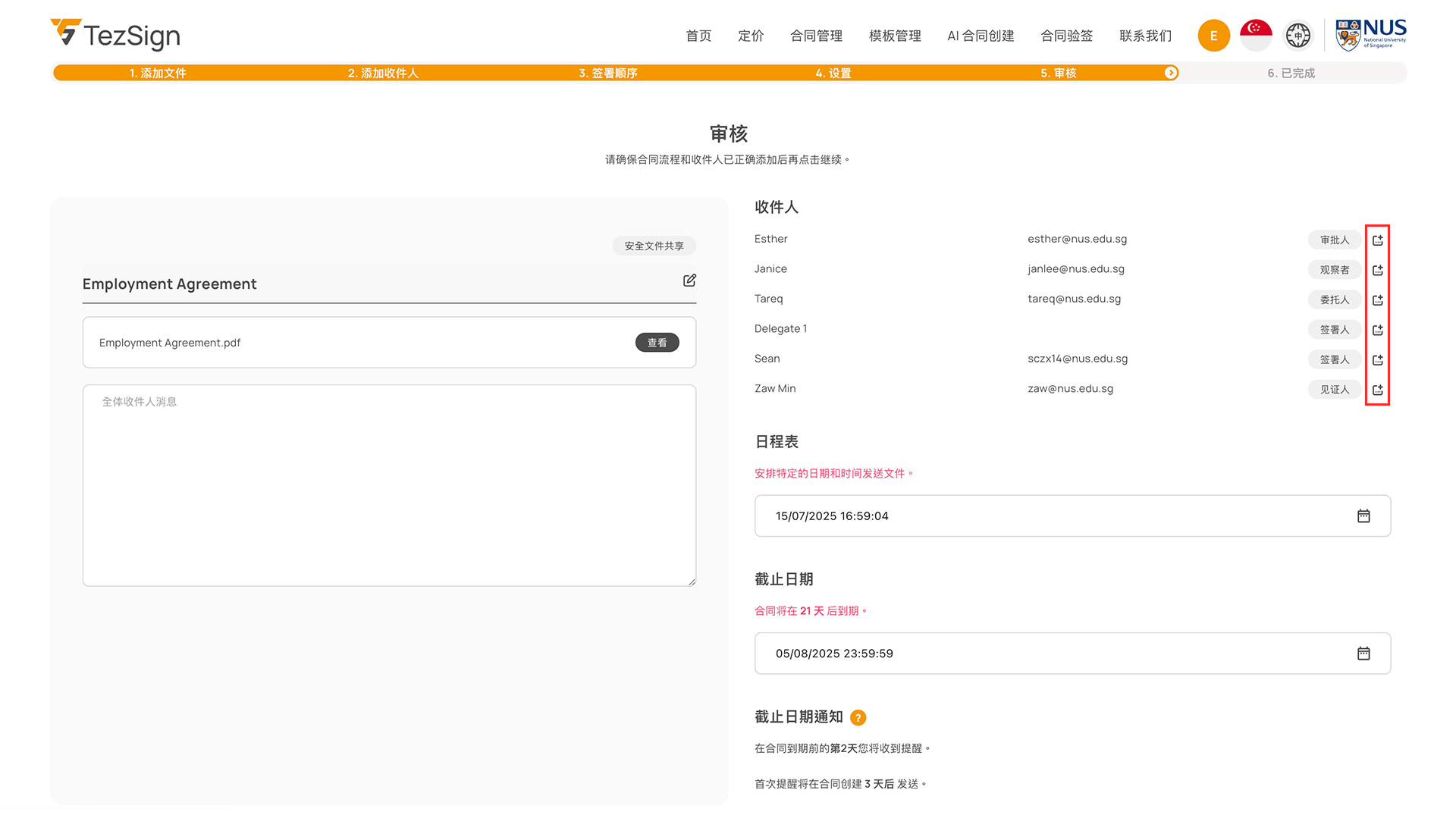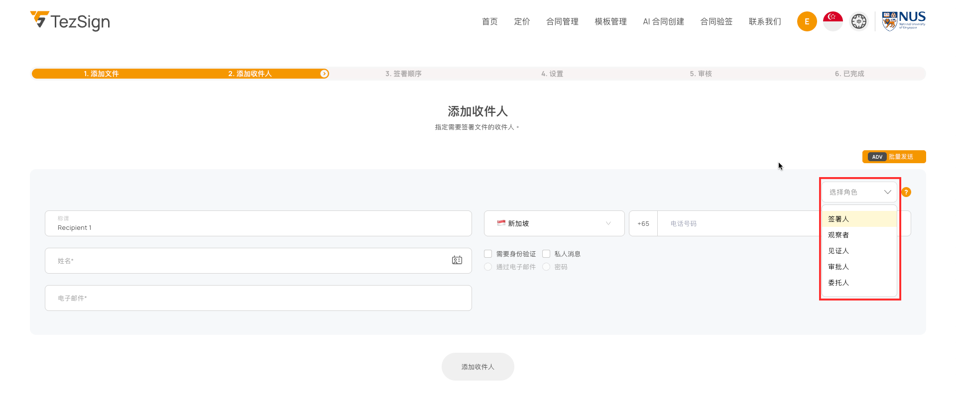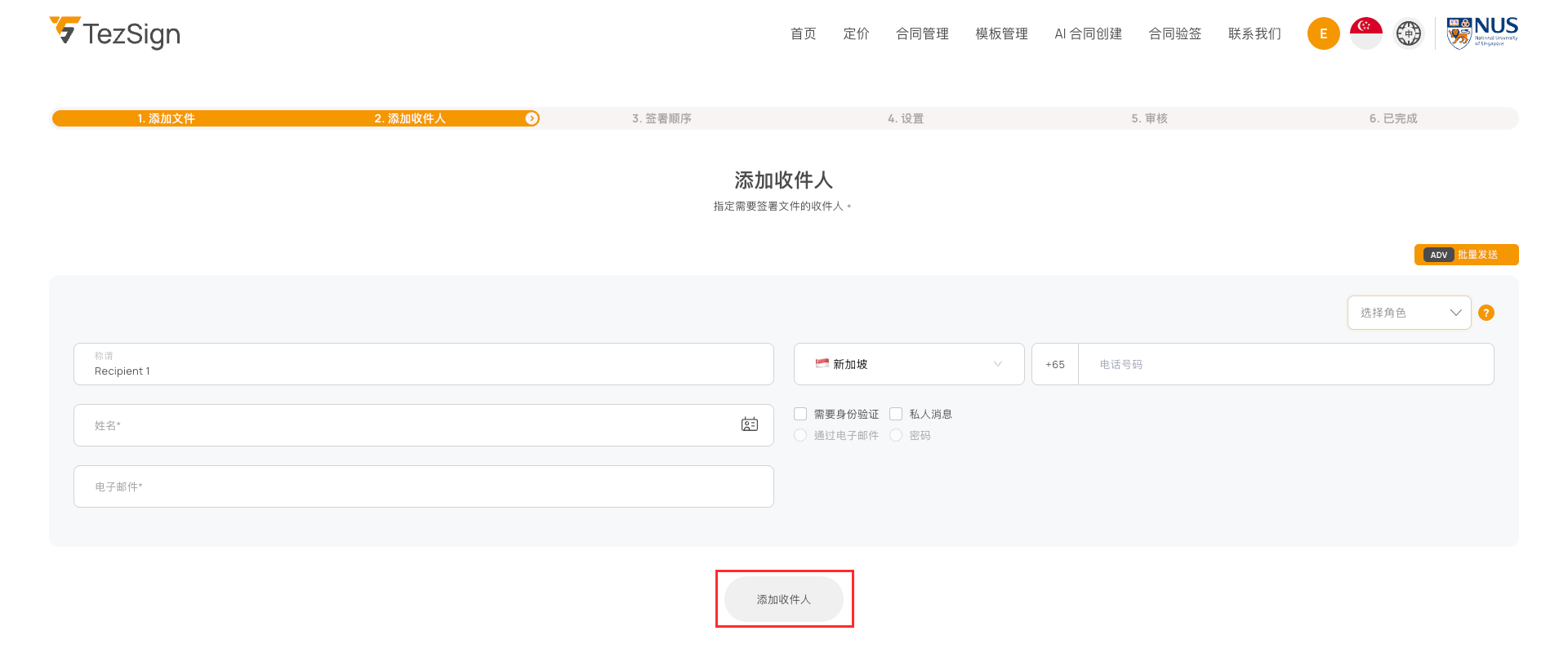 可点击“添加收件人”按钮,增加更多签署人或参与方。