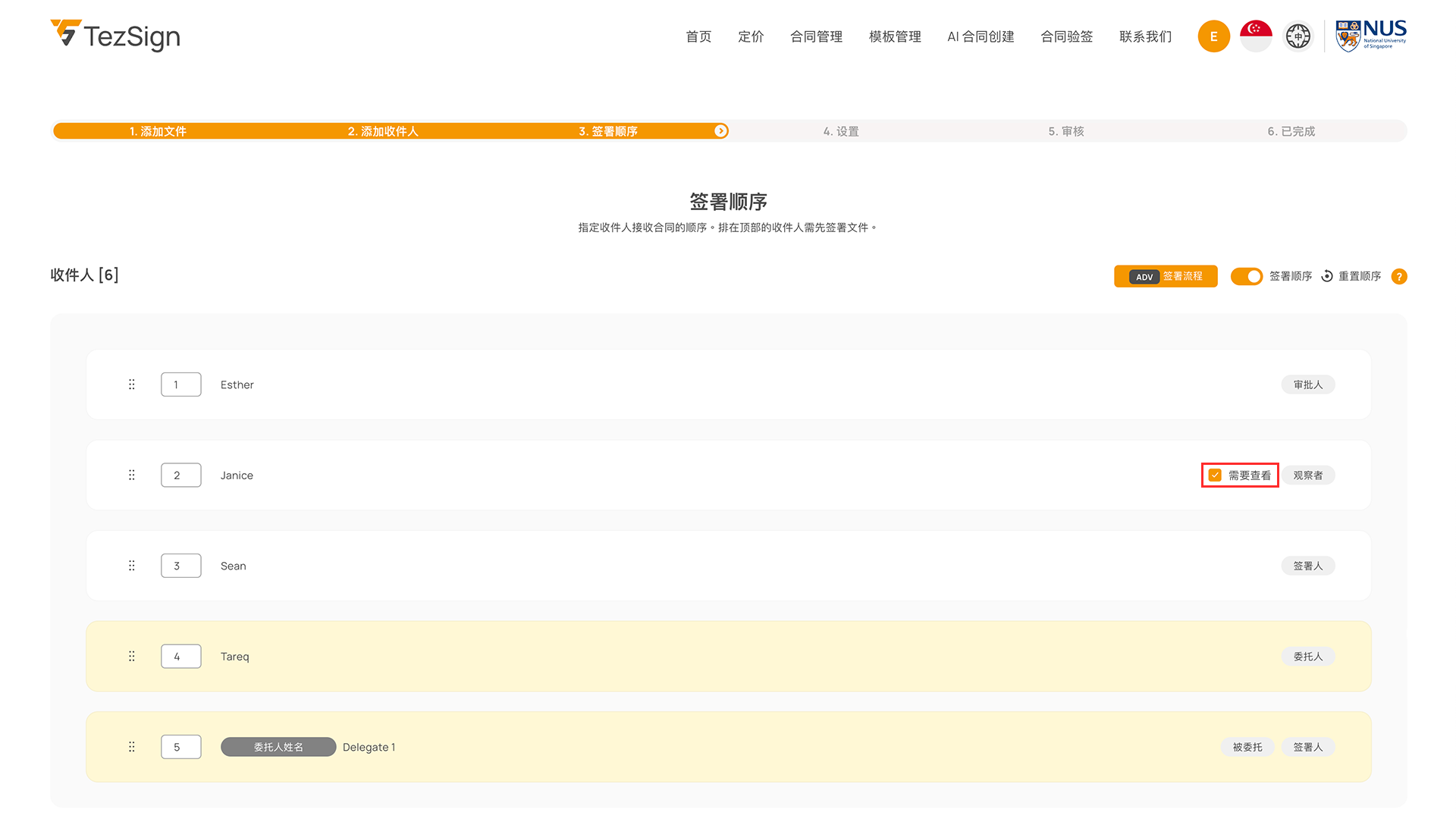 拖拽调整签署人顺序,或修改顺序编号。