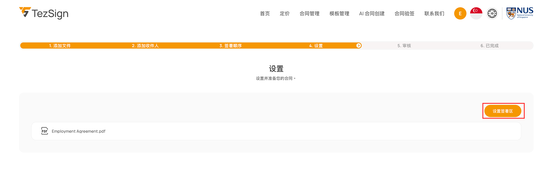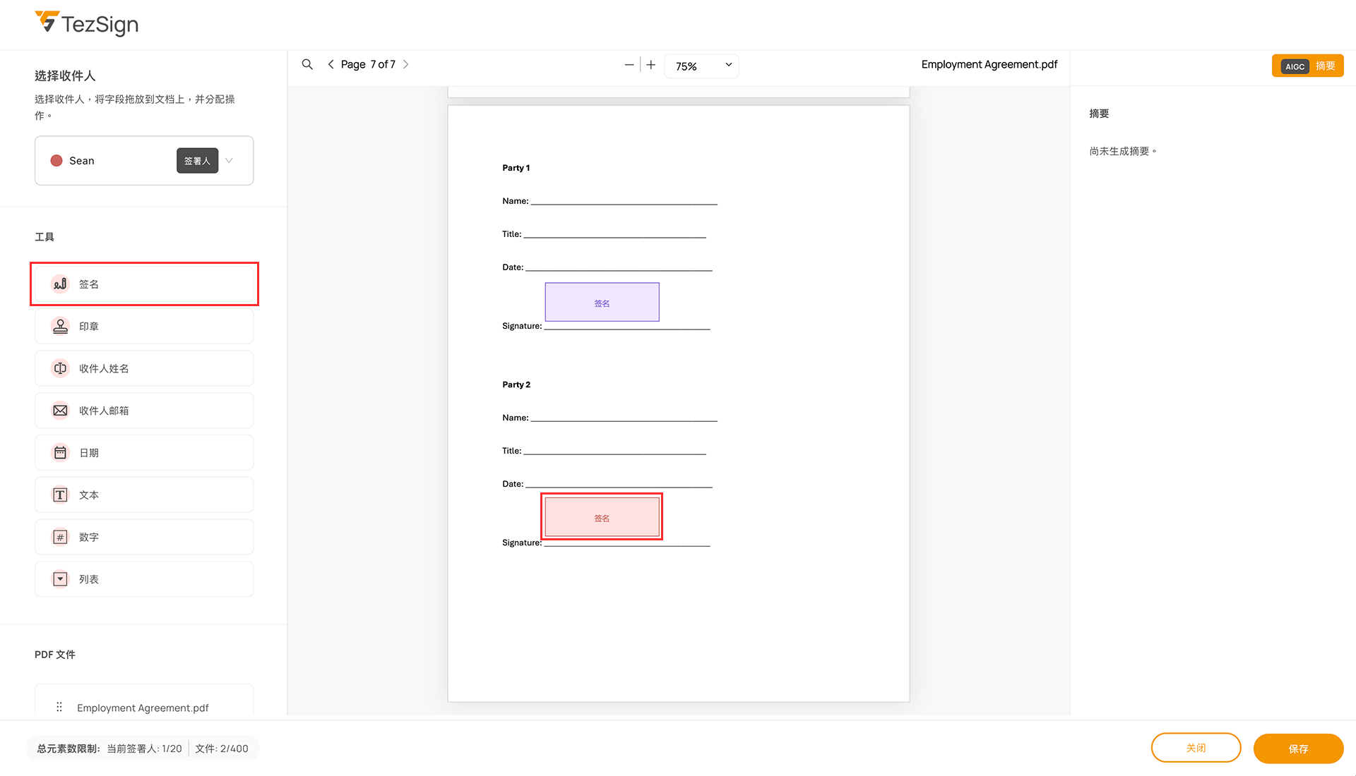 拖拽工具栏中的元素到合同上,每位收件人必须至少有一个签名区域。
