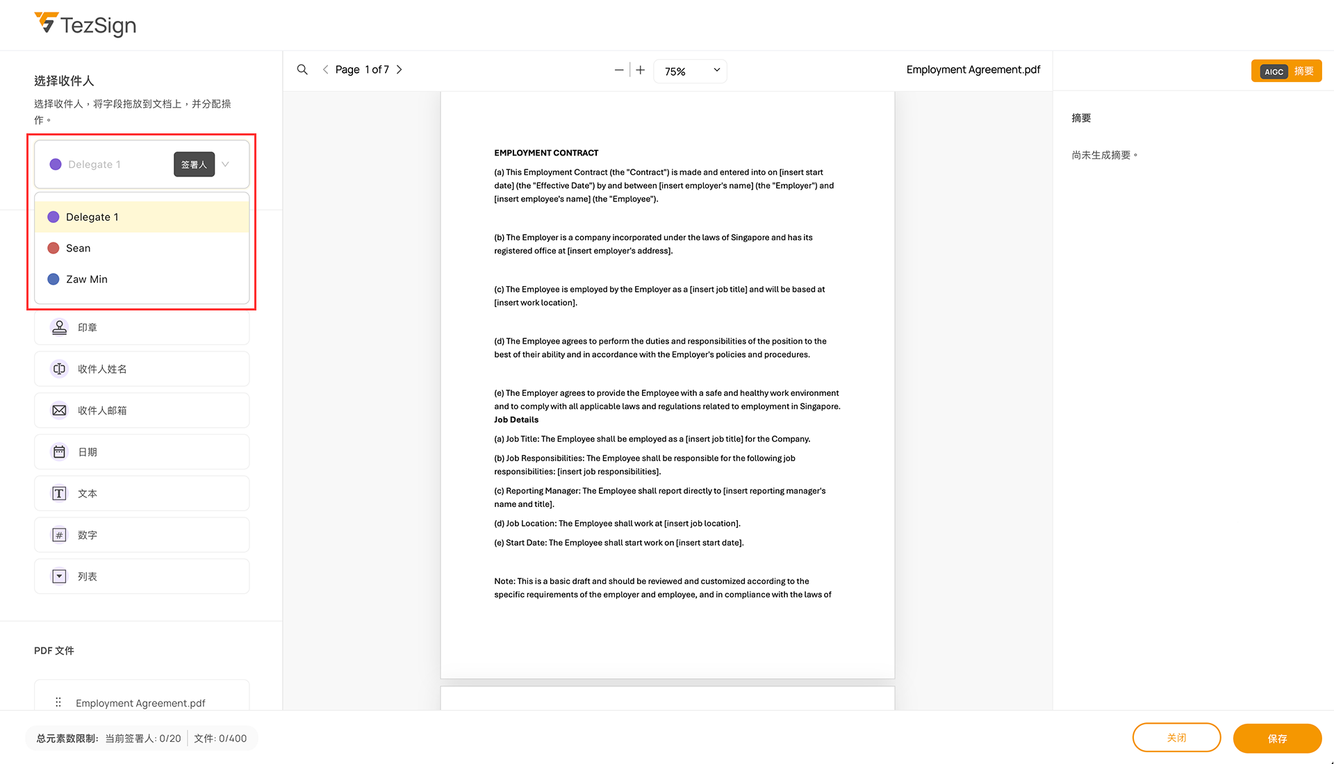 从下拉列表中选择收件人,不同角色对应不同颜色,方便通过颜色区分各自的签名区域。