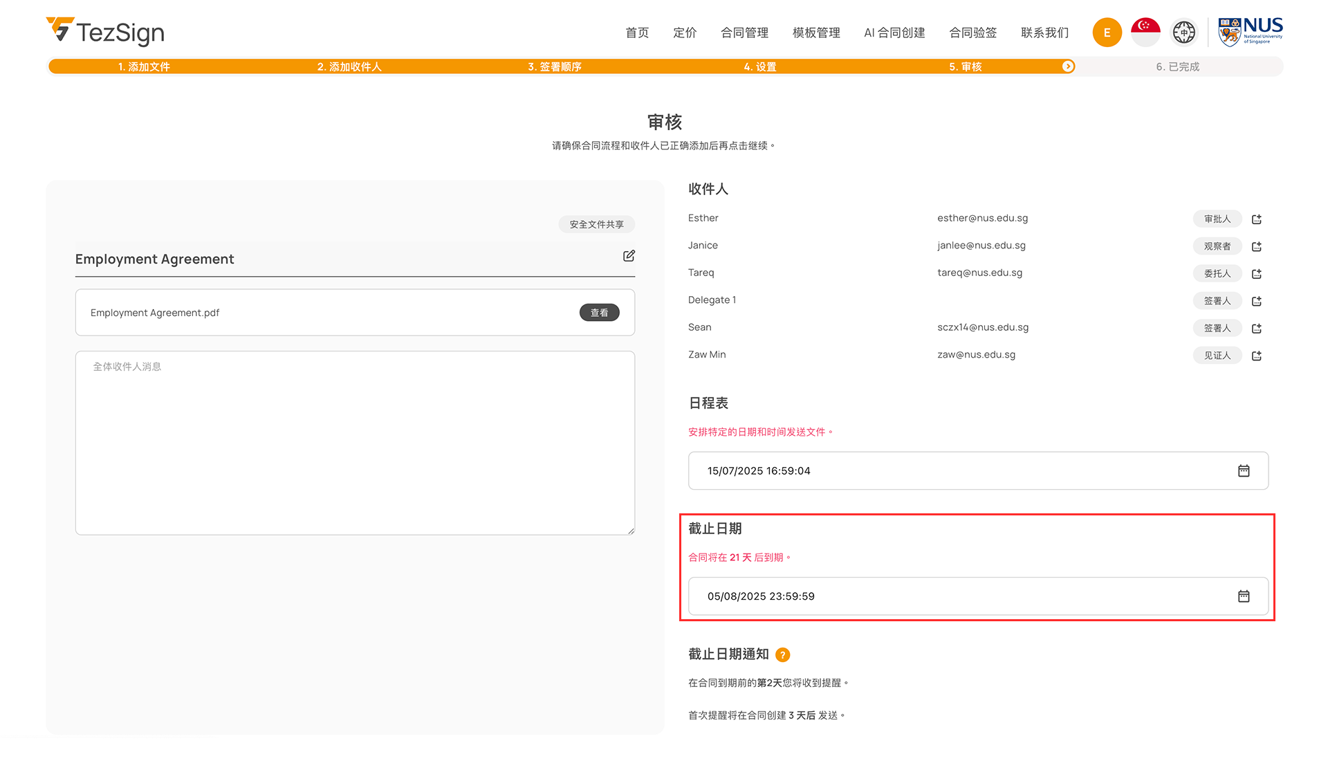 合同默认21天后过期,您可自定义具体日期与时间。